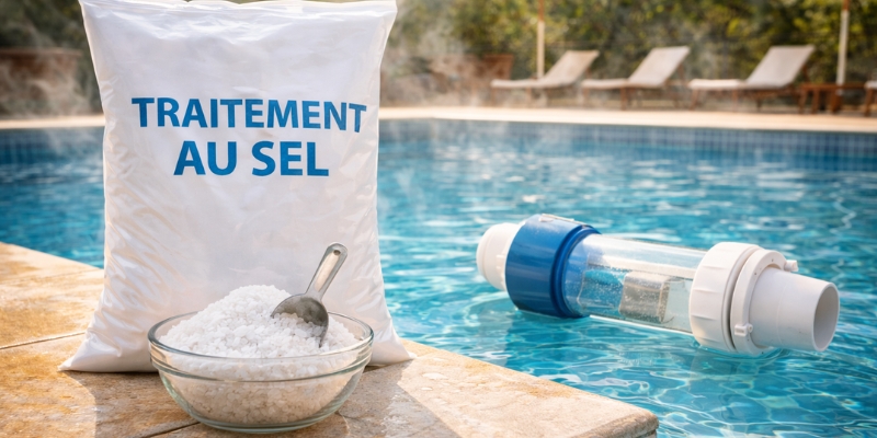 Le traitement au sel fonctionne par électrolyse : un appareil transforme le sel dissous dans l'eau en chlore de manière automatique. Il vous faut environ 3 grammes de sel par litre, soit 0,3% de concentration.